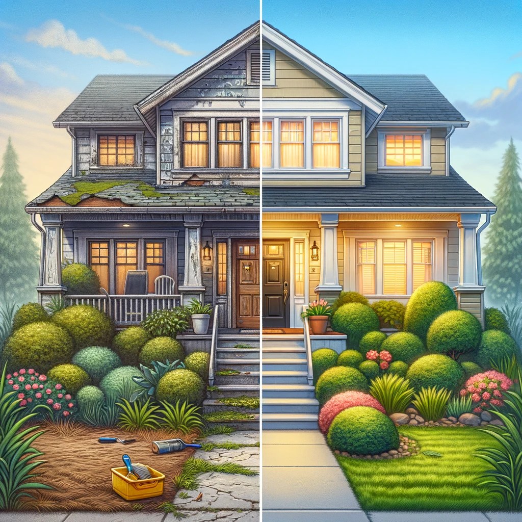 - Before: A house with peeling paint, overgrown bushes, and a cluttered front yard.